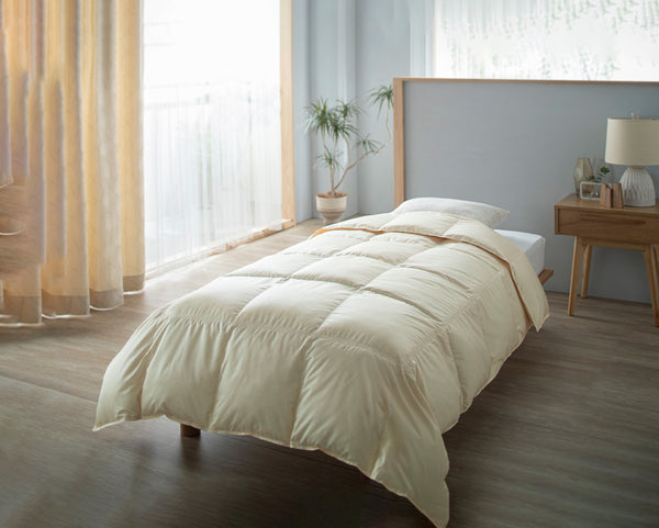 ベッドサイズに沿ったコの字ステッチで、ズレ落ちにくく、見た目もすっきり。デュベ感覚で使える、ベッド派のための羽毛ふとんです。