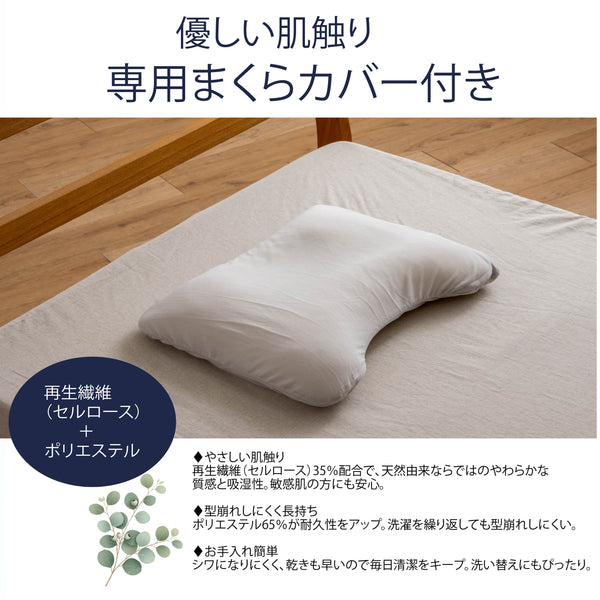 さらに、専用カバー付き。素材は再生繊維(セルロース)混で、肌にやさしくやわらかな手触り。ファスナー開閉仕様で着脱も簡単。枕本体を汚れから守り、長く衛生的にお使いいただけます。