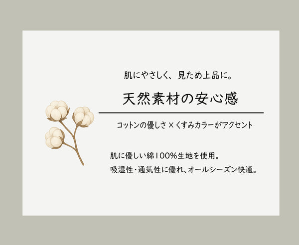 ・くすみグリー:「深呼吸したくなる色。自然を感じる、綿100%の心地よさ
