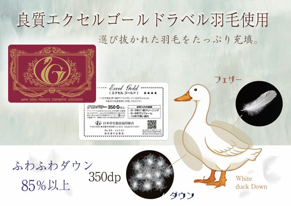 • 良品エクセルゴールドラベル羽毛使用し、保温性と通気性を両立。