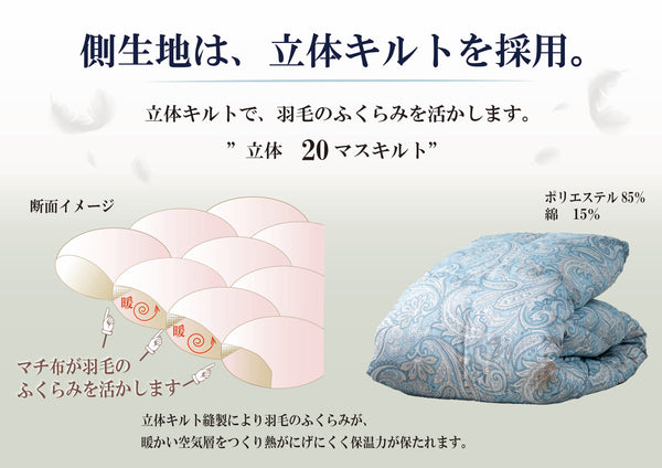 • 立体キルト4×5マス設計で、羽毛の片寄りを防ぎ均一なあたたかさ。